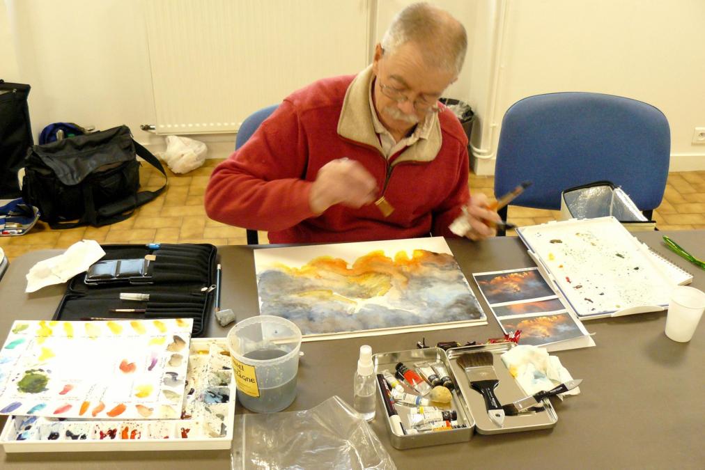 rouge écarlate ou rouge de cadmium, orange de mars, orange de cadmium, jaune de cadmium, jaune citron, bleu indanthrène, bleu de céruléum, terre de sienne brûlée ...